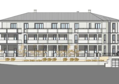 Abgeschirmt von der Betriebsamkeit der Hauptstraße ist diese Wohnanlage eine Oase der Ruhe. Klare, moderne Formen, große Fenster und großzügige Terrassen und Balkone prägen die äußere Gestaltung des Hauses.